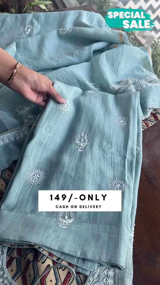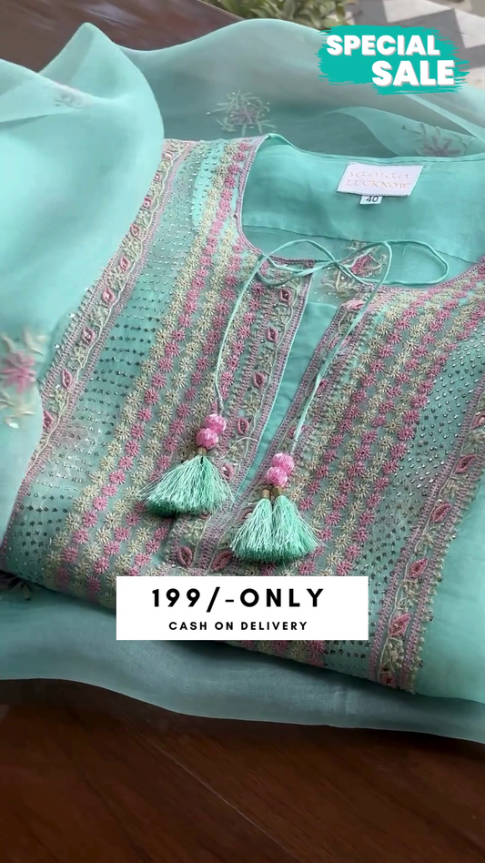 Sky Blue Tabby Organza Chanderi Thread Work Kurti With Plazo