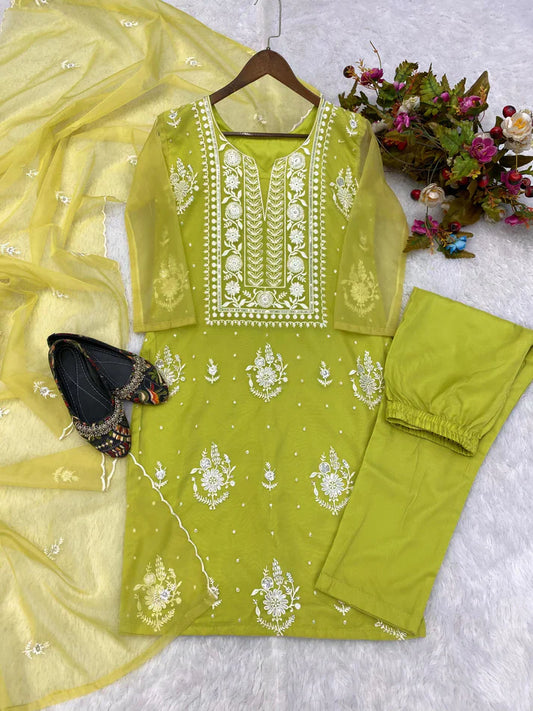Organza Chikankari Applique Kurta Set Prussian Blue Colour