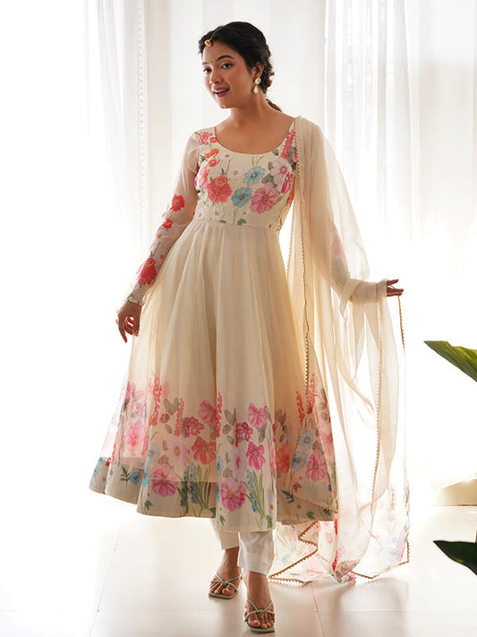 Cream Flower Printed Anarkali Gown With Pant & Dupatta Set