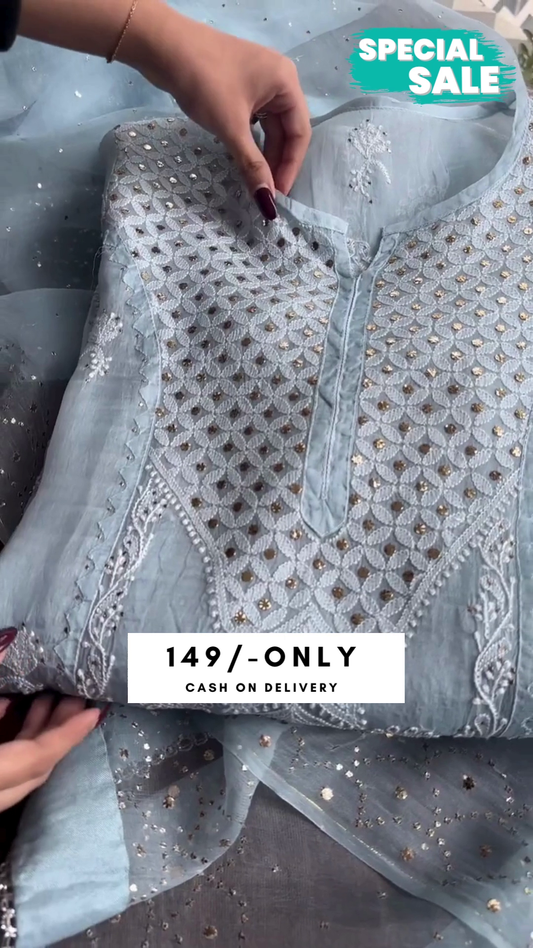 Sky Blue Color Tabby Organza Silk Wear Suit For Girls