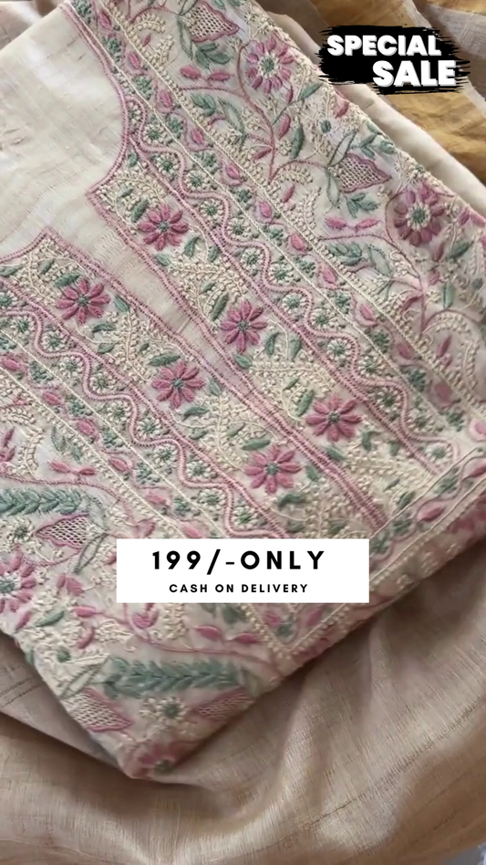 Glaze Cotton Thread Work Embroidered Unstitched Suit and Glaze Cotton Embroidered Pant With Chanderi Silk Thread Embroided Dupatta